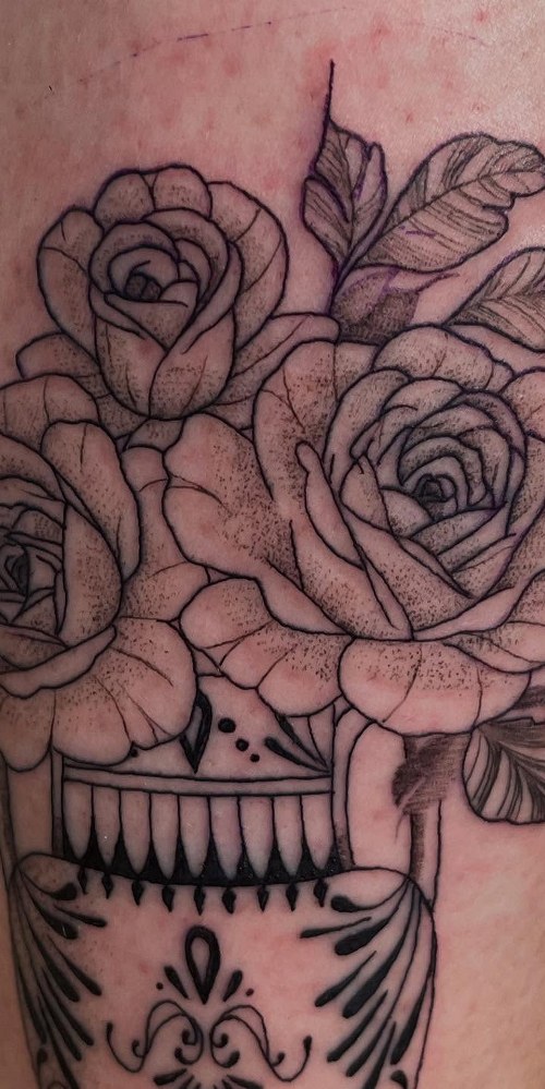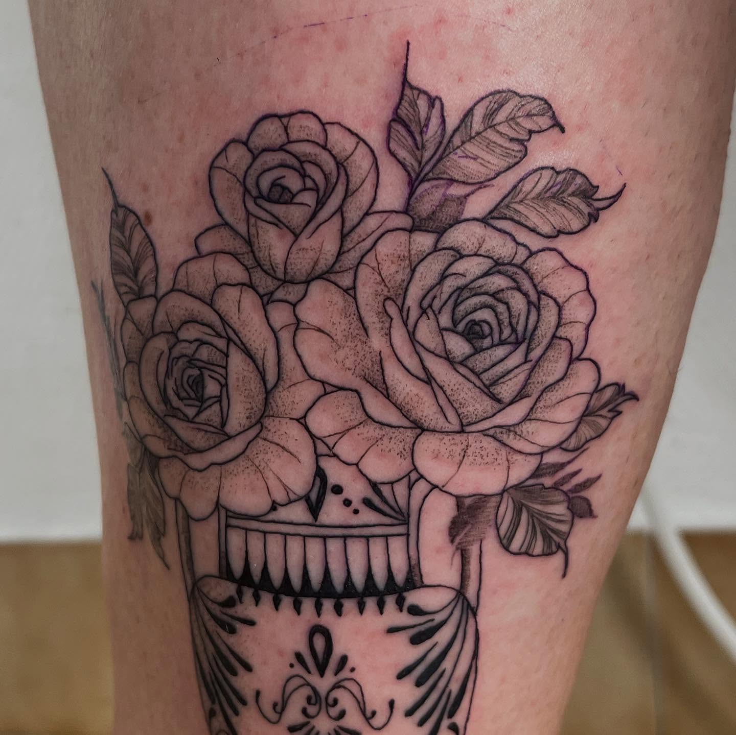 Tatoueuse très douée ! Je suis ravie de tous les tatouages réalisés, je ne cesse d’admirer le dernier ! (Vase+roses)